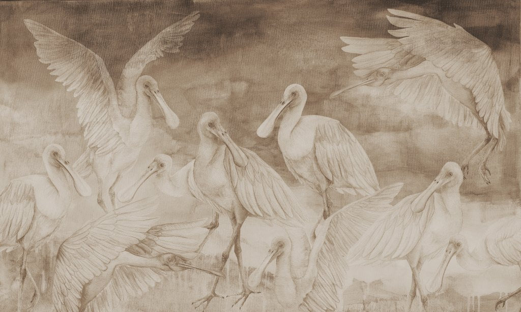 Ajaja Beige obrazuje urocze stado warzęch różowych, których łacińska nazwa to Platalea ajaja. Każda warzęcha została narysowana ręcznie z wyjątkową dbałością o szczegóły. Brązy, beże i odcienie złamanej bieli zastosowane we wzorze sprawiają, że jest on bardzo uniwersalny, stonowany i będzie stanowił nienachalną ozdobę większości ścian.