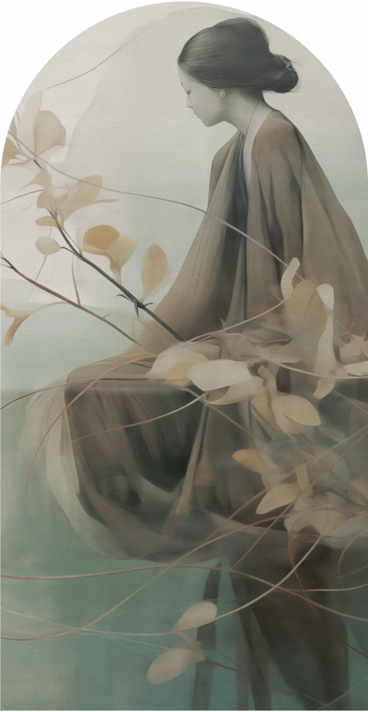Akogare przedstawia subtelną, eteryczną scenę z kobietą w delikatnej, zwiewnej, niemal płynącej szacie, siedzącą w otoczeniu eterycznych pnączy. Tło jest jasne, monochromatyczne, z delikatnymi, pastelowymi odcieniami beżu i zieleni. Kobieta, emanuje spokojem i kontemplacją, co tworzy atmosferę wyciszenia i medytacji i idealnie wpasuje się w przestrzenie o minimalistycznym, nowoczesnym wystroju wnętrz, gdzie dominuje prostota form i kolorów. Może stanowić piękny akcent w salonie, sypialni czy przestrzeni medytacyjnej, dodając wnętrzu delikatności i harmonii. Ze względu na subtelność i delikatność przedstawionej sceny, obraz ten doskonale komponuje się z naturalnymi materiałami, takimi jak drewno, len czy bawełna, oraz z pastelowymi dodatkami.