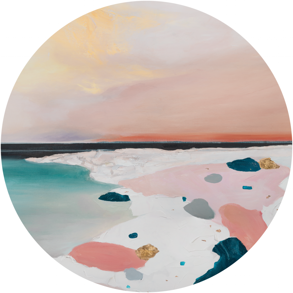 Fuerta / pierwotna nazwa obrazu - Barwy wiatru„Moją największą inspiracją jest przestrzeń natury” Kamieniste wybrzeża, piaszczyste plaże, kolorowe niebo o zachodzie słońca... ten energetyzujący, letni pejzaż idealnie wpasuje się w kreacje wnętrz odważnych, eklektycznych, a także super minimalistycznych.