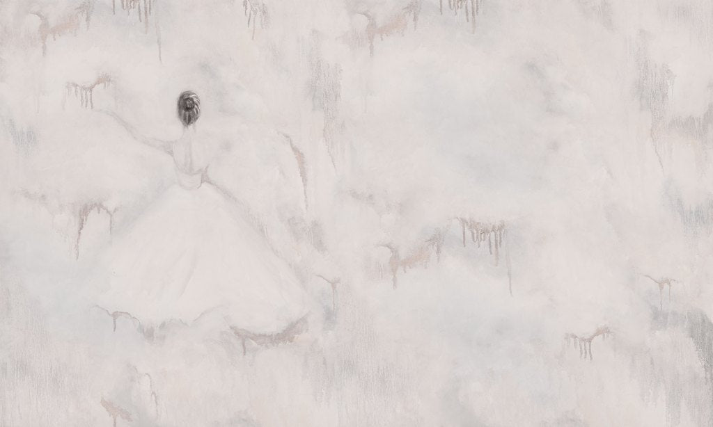 Delikatna kobieca sylwetka, jak ze snu na eterycznym tle w kolorach złamanej bieli, delikatnego różu i szarości. Bardzo, bardzo jasny wzór który będzie subtelną dekoracją niejednego wnętrza.