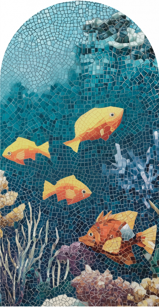 Tapeta „Oceania” to artystyczna podróż w głąb podwodnego świata – mozaikowa kompozycja tętniąca kolorem, życiem i energią oceanu. Motyw inspirowany jest rafą koralową i jej mieszkańcami – misternie ukazane ryby, koralowce i roślinność tworzą barwny, dynamiczny pejzaż morski. Struktura przypominająca ceramiczną mozaikę nadaje wzorowi oryginalny, rękodzielniczy charakter i wyrazistą fakturę, przywołując skojarzenia z włoską lub hiszpańską tradycją dekoracyjną.