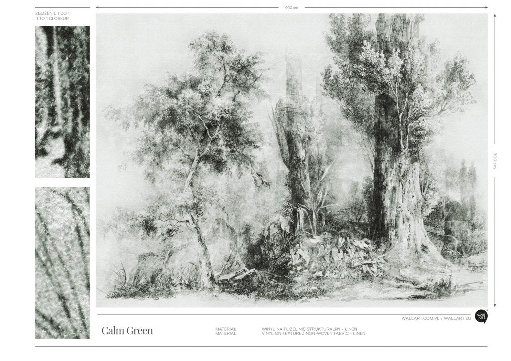Calm Green to wzór inspirowany sztuką, w kolekcji Nature, powstały na bazie obrazu z XVIIIw. Zielono czarny szkic przedstawiający drzewa, może być delikatną ozdobą każdego wnętrza. Tapeta nawiązuje do natury, wzór uspokaja, a jednocześnie jest bardzo oryginalny. Będzie pasował do salonu, kuchni, sypialni, łazienki czy biura.