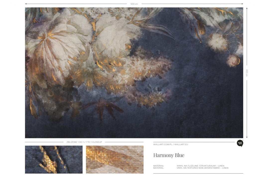 Tapeta Harmony Blue to bestsellerowy klasyczny wzór w barwach granatu, szarości, złamanych beżem i kolorach złota. Idealne uzupełnienie aranżacji w małych wnętrzach, pasuje do stylu boho, naturalnego, nowoczesnego i klasycznego.