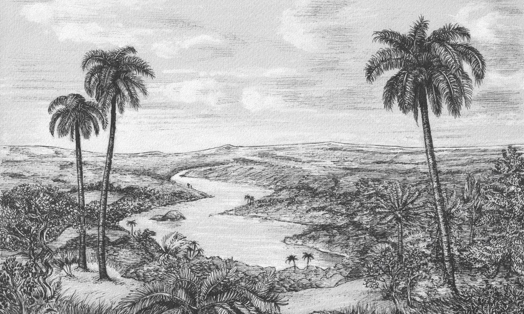 Palm to wizja oazy na libijskiej półpustyni. Krajobraz łączący w sobie bezkresny piasek, palmy oraz rzekę, dzięki szerokiej perspektywie optycznie powiększy wnętrze. Zastosowana technika rysunkowa sprawia, że pozornie zwyczajna tematyka obrazu, nabrała szlachetności i artyzmu.