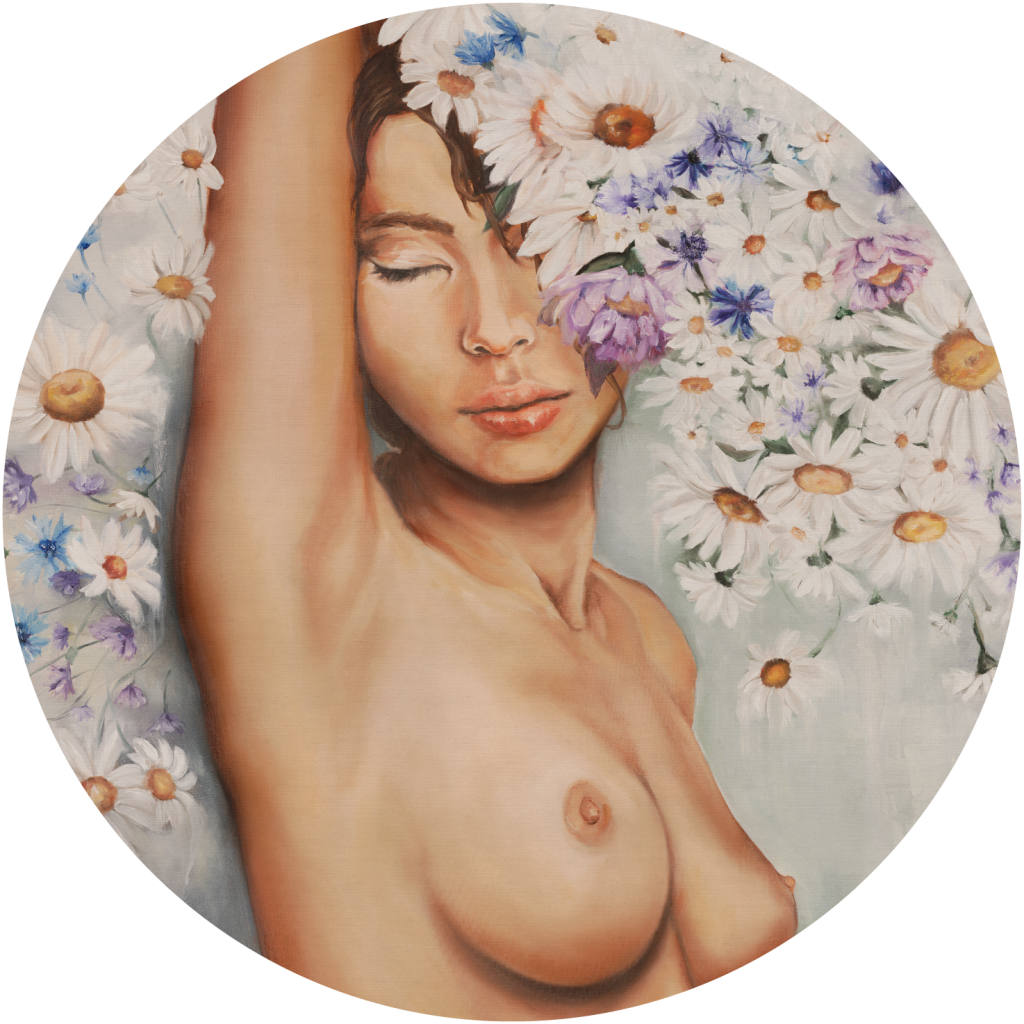 Nymph czyli nimfa, według greckiej i rzymskiej mitologii, młoda kobieta i uosobienie sił witalnych przyrody. Postać na obrazie Nymph emanuje spokojem, ale również pewnością siebie. Z kolei kwiat białej stokrotki jest symbolem czystości i niewinności, co sprawia, że mocny manifest kobiecego piękna zostaje złagodzony łagodnością kwiatów. Szare tło dodaje uniwersalności i pomimo zdecydowanej kolorystki centralnych części wzoru, doskonale skomponuje się z minimalistycznym wnętrzem w skali odcieni szarości. Nymph to świetny wybór do sypialni, salonu, ale również przestrzeniach publicznych, w których celebrowane jest kobiece piękno.