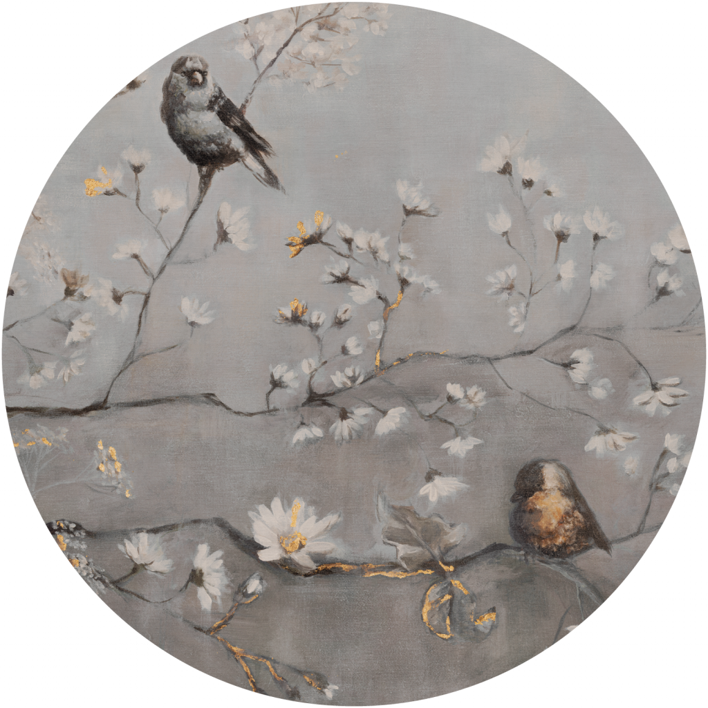 Swing jest tańcem kojarzonym z muzyką jazzową. Podobnie jak jazz, trel ptaków może nieść radość i energię, ale rownież być sentymentalny i pełen tęsknoty. Szarość obrazu Swing nadaje mu nieco tajemniczą aurę, sprzyjającą zadumie. Jednocześnie złote detale i delikatne kwiaty dodają niewinnego uroku i elegancji. Wzór łączy w sobie surowość pożądana przez miłośników minimalistycznych wnętrz, ale również nutę frywolności za sprawą elementów fauny i flory.