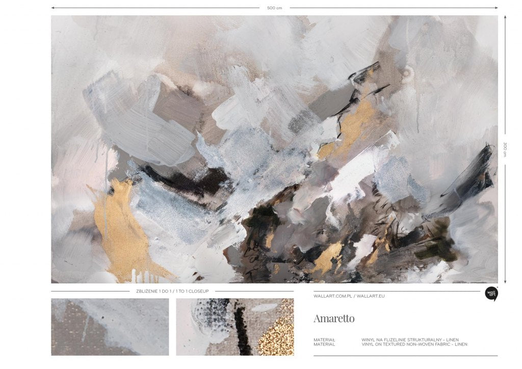 Amaretto przedstawia abstrakcyjną kompozycję w stonowanych odcieniach szarości, bieli i czerni z delikatnymi akcentami złota. Dominują na nim dynamiczne, nieregularne pociągnięcia pędzla oraz plamy, które tworzą wrażenie ruchu i głębi. Doskonale nadaje się do nowoczesnych wnętrz, gdzie stawia się na minimalistyczne, ale jednocześnie wyraziste dekoracje. Amaretto z powodzeniem może być centralnym punktem salonu, nadając mu elegancji i nowoczesnego charakteru. Idealnie sprawdzi się też w przestrzeniach, gdzie dominuje prostota i subtelna kolorystyka, dodając odrobinę luksusu i wyrafinowania. Złote akcenty będa współgrać z innymi metalicznymi elementami w pomieszczeniu, takimi jak lampy, ramki czy dekoracje, tworząc spójną i harmonijną całość.
