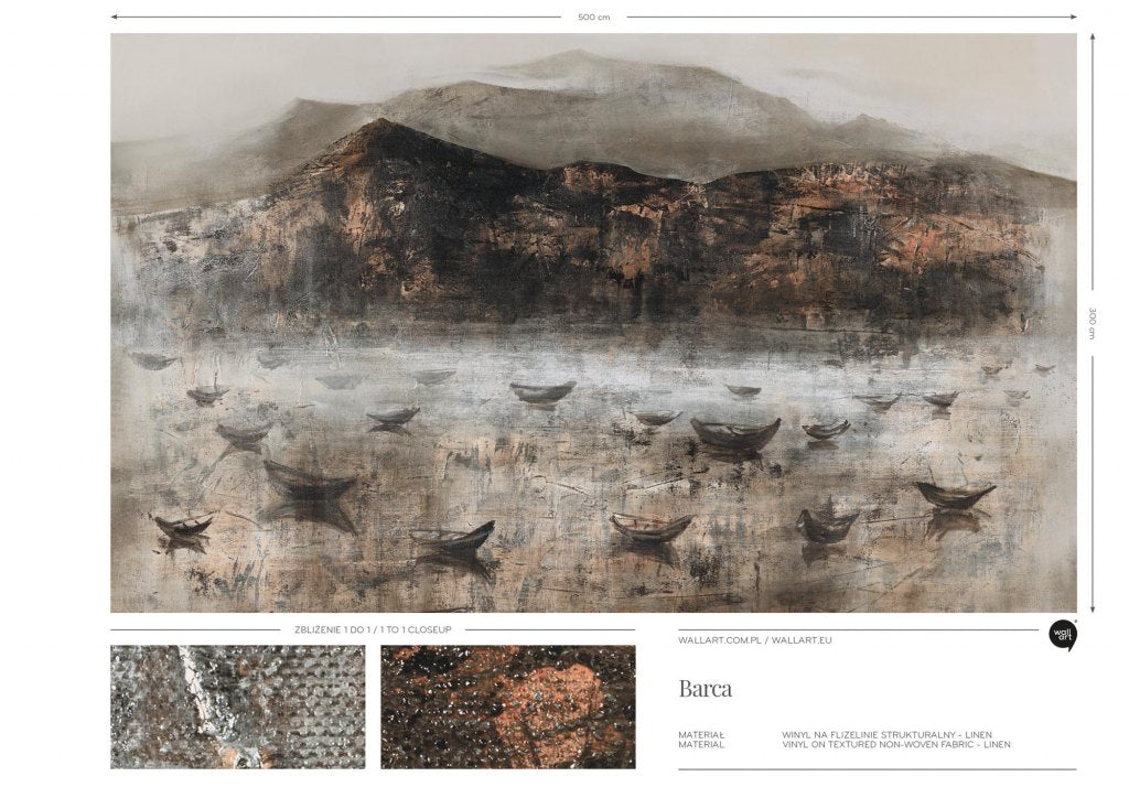 „Barca” to impresyjny pejzaż malarski przedstawiający spokojną taflę wody, po której dryfują drobne łodzie rybackie, a w tle wyłaniają się monumentalne, zamglone masywy górskie. Obraz oddaje wrażenie surowego, północnego poranka – jakby uchwycono moment ciszy przed świtem lub tuż po zmierzchu. Kompozycja jest pełna tekstur: od szorstkich, niemal fakturalnych pociągnięć pędzla, przez subtelne przejścia tonalne, aż po refleksy na wodzie, tworzące efekt delikatnego światła odbijającego się od powierzchni. Łodzie zostały ukazane w półcieniu – jak cienie zakotwiczone w przestrzeni, co nadaje wzorowi medytacyjny charakter. Ten wzór działa niemal jak obraz – opowiada historię, buduje nastrój i skłania do zatrzymania się na chwilę.