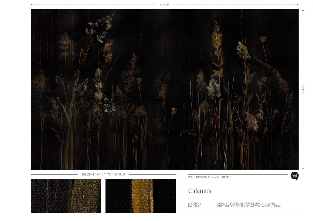 Calamus przedstawia smukłe, wysokie rośliny,trawy i polne kwiaty, które delikatnie wyłaniają się z ciemnego tła. Kompozycja ma stonowaną kolorystykę, w której dominują ciemne odcienie, przełamane subtelnymi akcentami w postaci jasnych, złocistych i brązowych liści oraz kwiatów. Rośliny są oddane z dużą precyzją, jednak całość sprawia wrażenie eteryczności i ulotności.