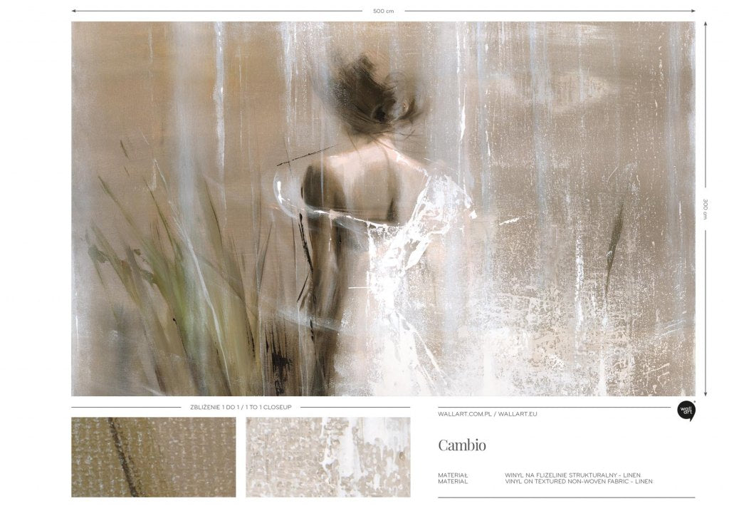 Cambio przedstawia sylwetkę kobiety widzianą od tyłu, zanurzoną w delikatnym i eterycznym otoczeniu, co potęguje wrażenie tajemniczości i ulotności chwili. Kobieta ubrana jest w lekką, półprzezroczystą suknię, która subtelnie opada na jej ramiona. Kolorystyka obrazu opiera się na stonowanych odcieniach beżu, szarości i bieli, co nadaje całości spokojny i romantyczny charakter. Wzór sprawdzi się w pomieszczeniach, które wymagają wprowadzenia subtelnej elegancji i harmonii. W sypialni obraz ten może wprowadzić atmosferę spokoju i intymności, sprzyjając relaksowi i wyciszeniu. Umieszczony nad łóżkiem lub na przeciwległej ścianie, będzie harmonizował z jasnymi tekstyliami, miękkimi tkaninami i naturalnymi materiałami, tworząc przytulną i kojącą przestrzeń. Z kolei w łazience może dodać wnętrzu luksusu i elegancji. Subtelne barwy i delikatne detale będą współgrać z bielą kafelków, drewnianymi akcentami i roślinnymi dekoracjami, tworząc spa-like atmosferę, idealną do odprężających kąpieli.
