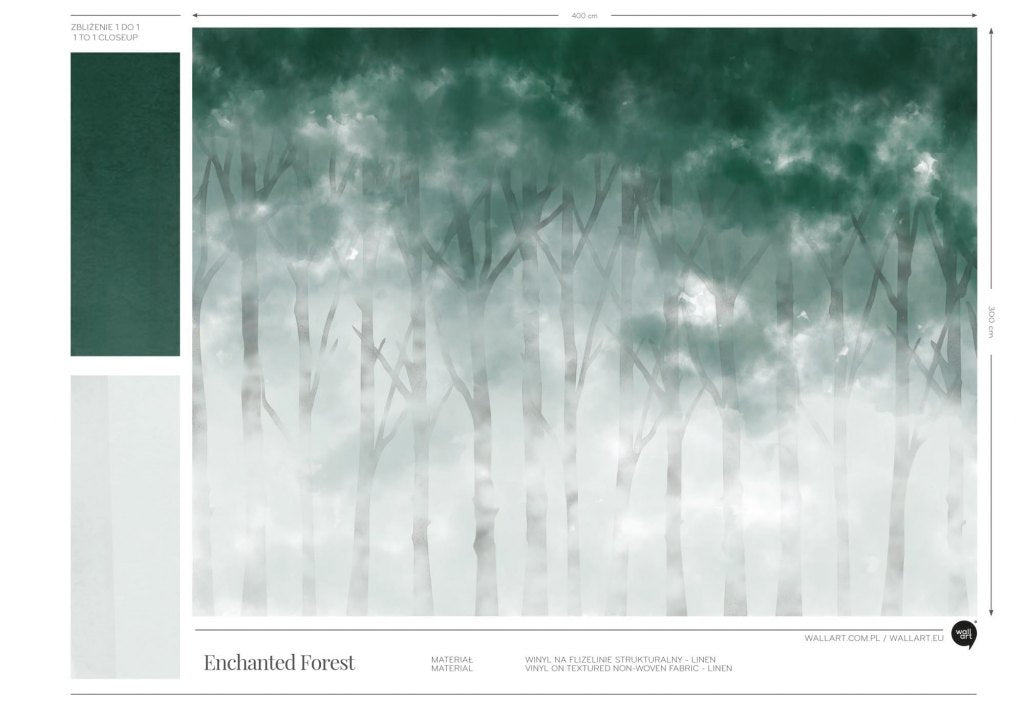 Enchanted Forest to wzór powstały z połączeni struktury niejednolitego ombre w barwie chłodnej butelkowej zieleni oraz tatuażu ze wzoru zimowy las. Płączenie ombre z motywem roślinnym nadaje tapecie niezwykłej elegancji i lekkości oraz odrobiny tajemniczości.