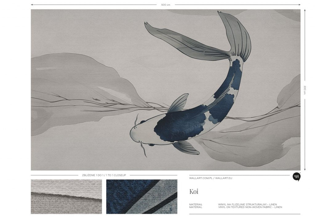 „Koi” łączy chłodne, zgaszone odcienie – dominują tu grafitowe błękity i szarości zestawione z miękkim tłem w tonacji jasnego pudrowego beżu. Ten zestaw kolorów nie tylko podkreśla elegancję wzoru, ale również pozwala mu wtopić się w przestrzeń – tworząc atmosferę ciszy, głębi i wyważonego stylu.