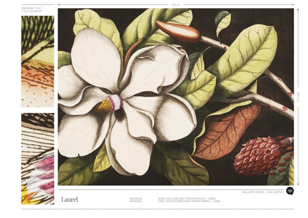 Wzór z kolekcji Noire, inspirowany wielką sztuką. Laurel jest reprodukcją obrazu holenderskiego malarza z XVII wieku. Zaproś sztukę do swojego wnętrza. Ciemny motyw z centralnym białym punktem kwiatowym nadaje tapecie ciężkości i wyrazistości. Bogaty i intensywny wzór będzie idealną ozdobą wnętrz minimalistycznych oraz klasycznych.