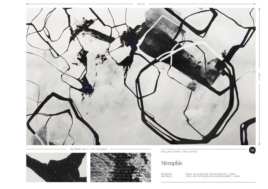 „Memphis” to kompozycja oparta na dynamicznych, ręcznie malowanych liniach tworzących organiczne, nieregularne formy. Przeplatające się kontury przypominają struktury minerałów lub pęknięcia w marmurze, a zarazem zachowują lekkość i ekspresję spontanicznego gestu. Wzór emanuje ruchem i rytmem, który przyciąga uwagę, ale nie przytłacza przestrzeni.