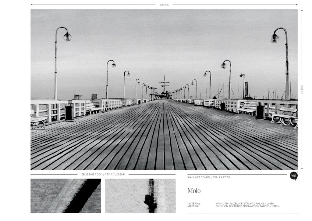 Molo to czarno-biała grafika przedstawiająca wizytówkę Sopotu.Symetryczne lampy uliczne oraz drewniane deski molo prowadzą wzrok w kierunku centrum wzoru, gdzie widać zarys statku. Molo świetnie sprawdzi się w nowoczesnym salonie, dodając mu minimalistycznego, a jednocześnie wyrafinowanego charakteru. Może być również doskonałym uzupełnieniem wnętrz w stylu marynistycznym lub skandynawskim, gdzie stonowane kolory i proste linie są kluczowe. Grafika ta, dzięki swojej monochromatycznej kolorystyce, może harmonijnie komponować się z różnorodnymi paletami barw w pomieszczeniu, w tym stanowić interesujący kontrast w bardziej kolorowych wnętrzach, nadając im wyrafinowanego akcentu i podkreślając elegancję całej aranżacji.