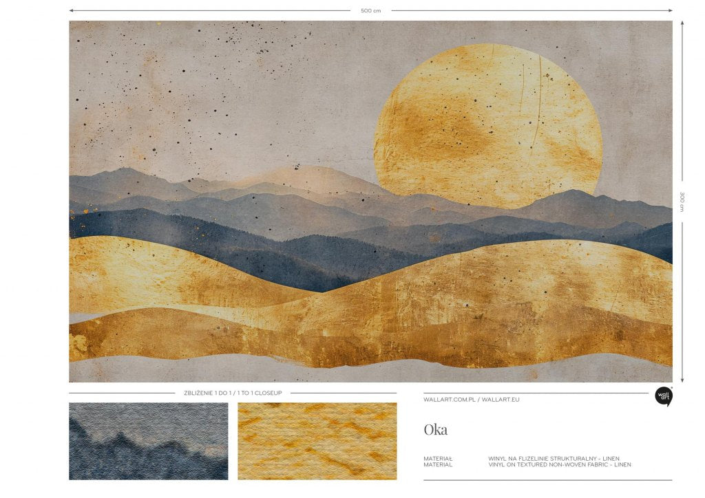Oka przedstawia spokojny krajobraz ze spektakularnym, złotym słońcem wznoszącym się nad warstwami wzgórz, które są utrzymane w odcieniach niebieskiego i złota. Delikatne przejścia kolorystyczne i tekstura nadają mu artystycznego, niemal abstrakcyjnego charakteru. Oka idealnie pasuje do nowoczesnych wnętrz, w których dominują neutralne kolory i minimalistyczny design. Może być centralnym elementem dekoracyjnym w salonie, gdzie przyciągnie uwagę swoim spokojem i elegancją, dodając wnętrzu ciepła, przytulności i luksusu. W sypialni obraz ten może wprowadzać atmosferę relaksu i harmonii, sprzyjając wyciszeniu i odpoczynkowi.