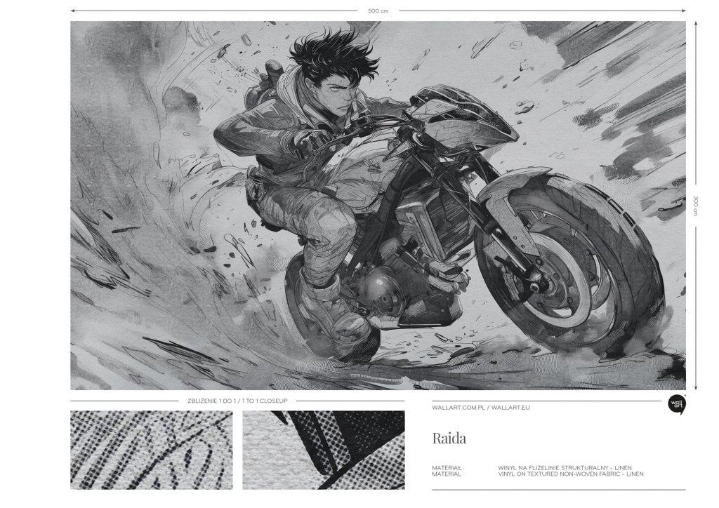 Raida przedstawia dynamiczną grafikę motocyklisty w pełnym pędzie. Czarnobiałe szkic, detale motocykla oraz postaci tworzą wrażenie ruchu i przyspieszenia, co sprawia, że przestrzeń nabiera nowoczesnego i ekscytującego charakteru. Raida doskonale nadaje się do aranżacji pokojku nastolatka, gdzie dynamizm i pełen akcji wzór idealnie odda młodzieńczą energię i pasję do sportów ekstremalnych. Raida to znakomita dekoracja, która odzwierciedli zainteresowania i hobby młodego mieszkańca, nadając pokoju indywidualnego charakteru i wyróżniając go spośród standardowych aranżacji.
