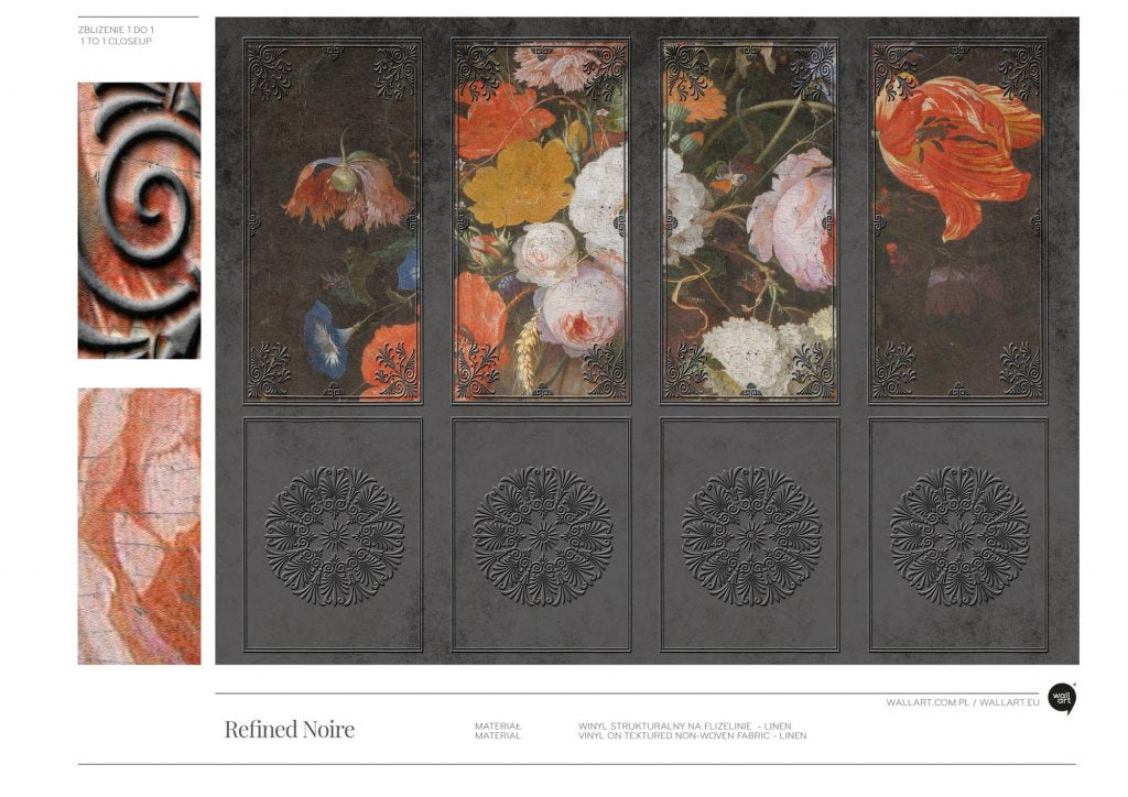 Wzór z kolekcji Classic, inspirowany wielką sztuką. Tapeta powstała z połączenia zdjęć zdobnych sztukaterii, z zabytkowych pałacy i dworków oraz reprodukcji obrazu XVII w malarza, Abrahama Mignona. Zaproś sztukę do swojego wnętrz. Tapeta wspaniałe prezentuje się na strukturze betonu oraz craft dodając wnętrzu elegancji.