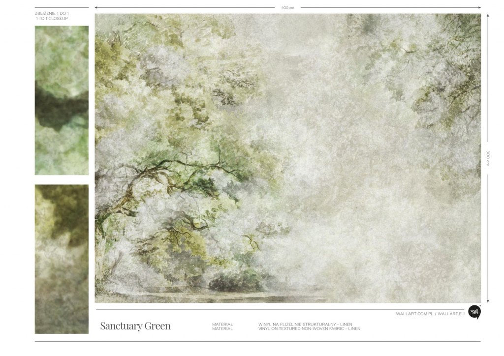 Sanctuary Green to wzór inspirowany sztuką, w kolekcji Nature. Tapeta przedstawia delikatny zarys korony drzew, umieszczony niesymetrycznie na strukturze delikatnego betonu. Wzór jest bardzo neutralny i elegancki. Będzie pasował do każdego pomieszczenia, a użytkownikom pozwoli się wyciszyć. Idealnie wkomponuje się w styl naturalny, skandynawski i boho.