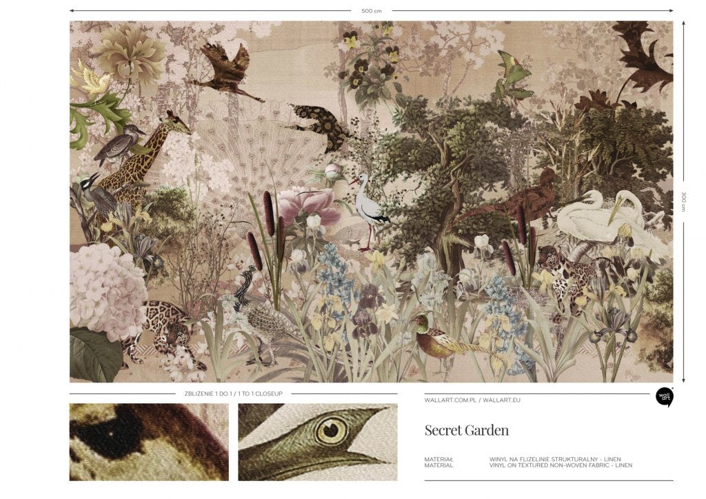 Secret Garden czyli tajemniczy ogród, skrywa w sobie wiele tajemnic i niespodzianek. Dzięki zastosowanej technice kolażu, wzór jest bardzo bogaty w detale, ale skupia się na motywach flory i fauny. Mnogość elementów została stonowana ujednoliceniem kolorystyki do ciepłych beży i pudrowego różu. Secret Garden to bez wątpienia wzór odważny, który idealnie połączy się z drewnianymi elementami i jasnymi, stonowanymi meblami.