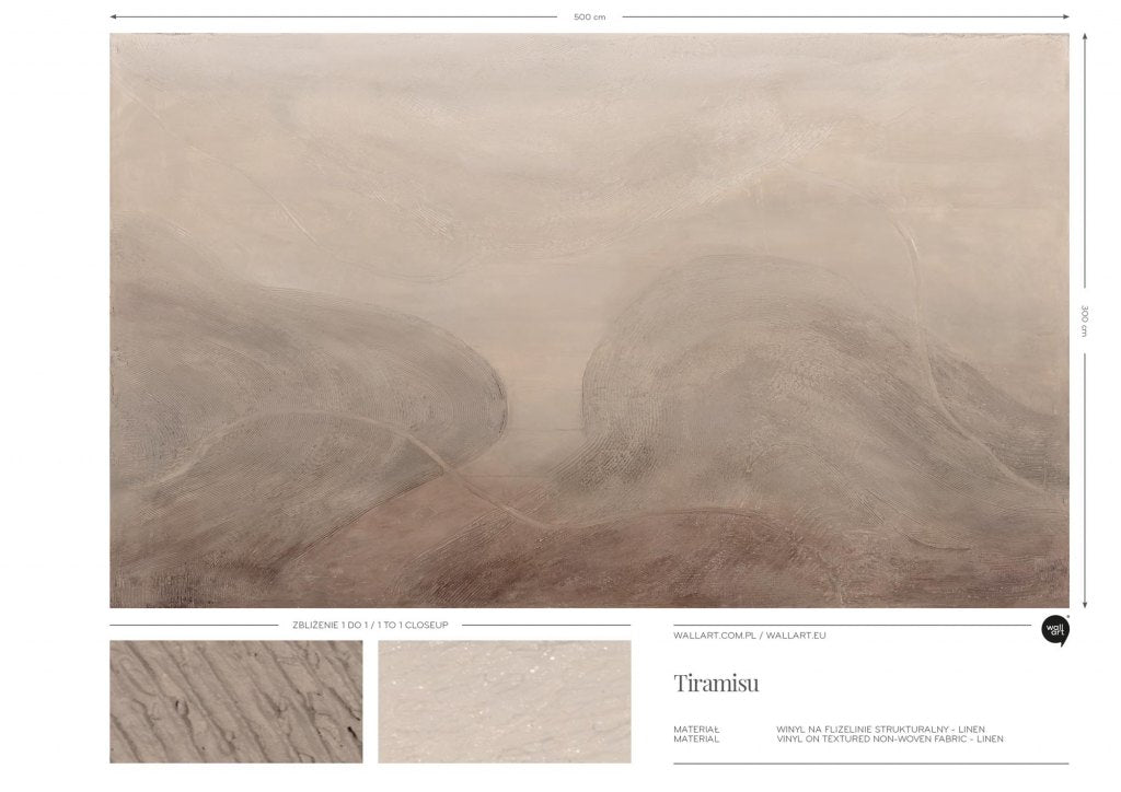 Tiramisu to delikatna, abstrakcyjna kompozycja w delikatnych, beżowych odcieniach, które tworzą subtelne, organiczne kształty przypominające pofałdowany krajobraz. Cała powierzchnia wzoru jest delikatnie teksturowana, co nadaje mu trójwymiarowy efekt i sprawia, że wygląda jakby był pokryty delikatnymi liniami i wzorami, tworzącymi harmonijne fale. Dzięki neutralnej kolorystyce i subtelnej formie, Tiramisu doskonale nadaje się do wnętrz urządzonych w stylu minimalistycznym, skandynawskim lub nowoczesnym, ale nie tylko. To bardzo wszechstronny i elegancki wzór, który doda przestrzeni spokoju, harmonii i wyrafinowanego charakteru, idealnie komponując się z różnorodnymi stylami dekoracyjnymi i tworząc przyjemną, estetyczną atmosferę.