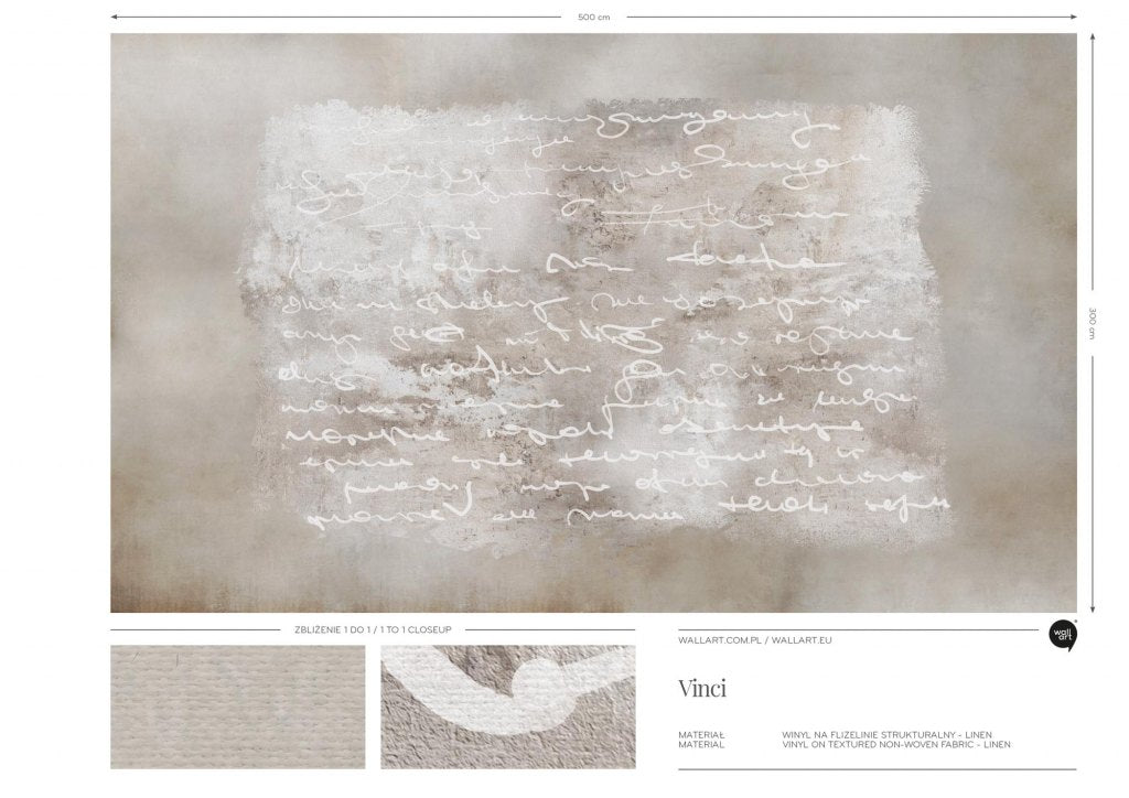 Vinci to tajemniczy wzór, na którym widnieje fragment tekstu zapisany białymi, ręcznie malowanymi literami, na jasnym tle. Tekst jest nieczytelny, przypomina szkice lub notatki, które tworzą delikatny, artystyczny efekt na powierzchni płótna. Całość utrzymana jest w stonowanych odcieniach beżu, szarości i bieli, co nadaje obrazowi subtelny, elegancki charakter. Vinci doskonale nadaje się do minimalistycznych, nowoczesnych przestrzeni, gdzie liczy się prostota i subtelne akcenty dekoracyjne. Jego delikatna kolorystyka i artystyczny motyw ręcznie pisanych liter wprowadzą do wnętrza element intelektualnej tajemnicy i artystycznego wyrafinowania. Idealnie sprawdzi się jako ozdoba ściany w domowej bibliotece, gabinecie, czy salonie, gdzie dominują jasne barwy i proste formy.