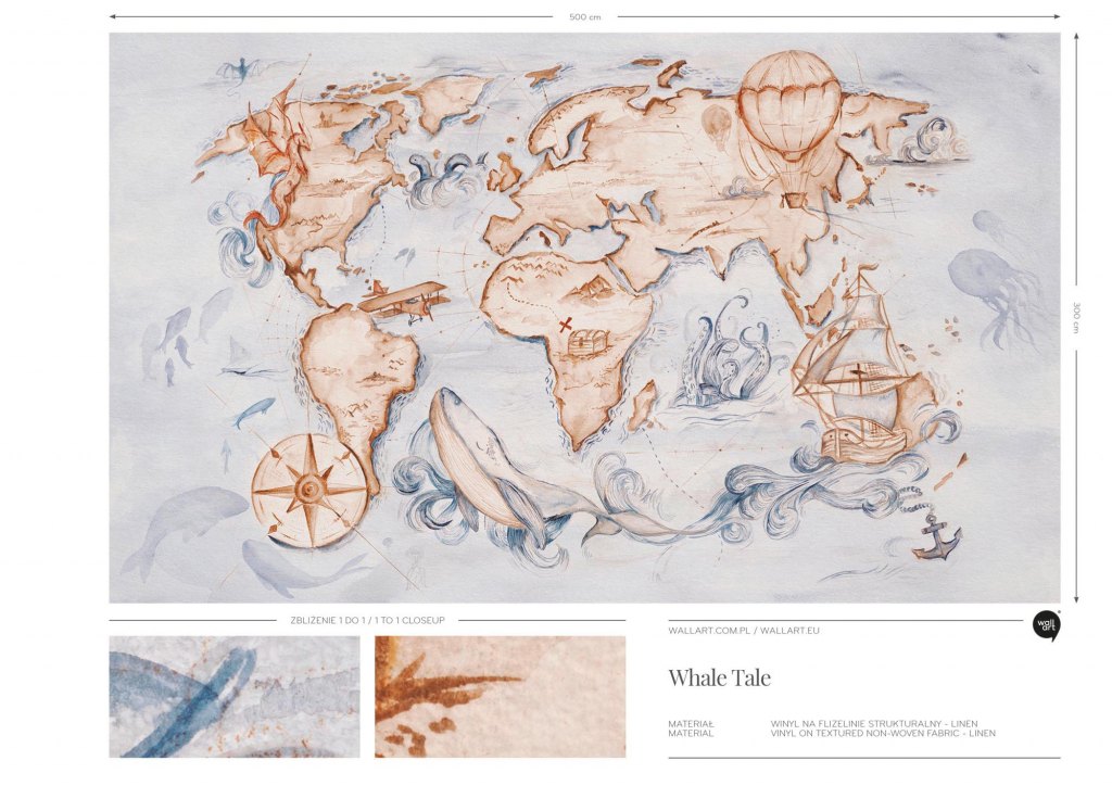 Whale Tale to idealny wybór dla małych wielbicieli podróży. Mapa świata w akwarelowym, bajkowym wydaniu pozwoli odpłynąć wyobraźni w fascynujący świat przygód, odkrywania nowych lądów i gatunków. Ciepłe, barwne kolory wzoru pozwolą na zaaranżowanie pokoju dla dziecka w każdym kolorze. Idealnie wpasuje się w nowoczesne wnętrze lub urządzone w stylu naturalnym czy boho.
