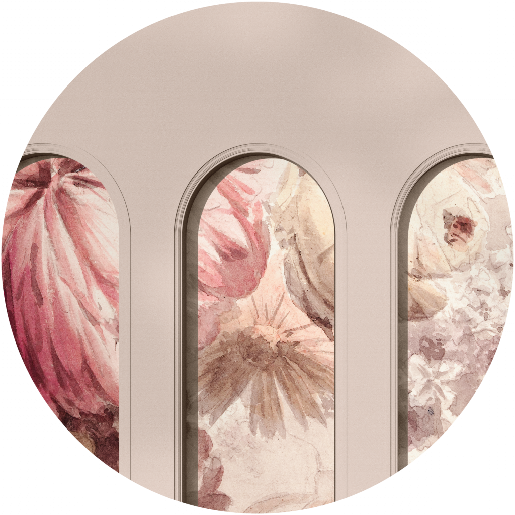 Z kolei Harmony jest reprodukcją obrazu holenderskiego malarza z XVIII wieku. Harmonijne połączenie różu z błękitem tworzy piękną kompozycję wsród mniejszych kwiatowych pąków. Bogaty i zdobny wzór będzie idealną ozdobą wnętrz minimalistycznych oraz klasycznych.