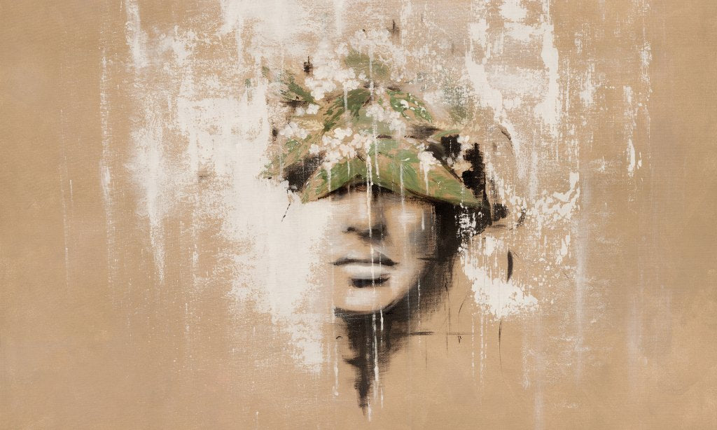 Castagna to tajemniczy wizerunek kobiecej twarzy kryjącej się za nieoczywistym motywem roślinnym. Delikatna zieleń liści i drobne białe kwiaty dodają romantyzmu i lekkości zagadkowym portretowi. Zastosowana nienachalna kolorystyka sprawi, że każde stonowane, minimalistyczne wnętrze stanie się kompletne.