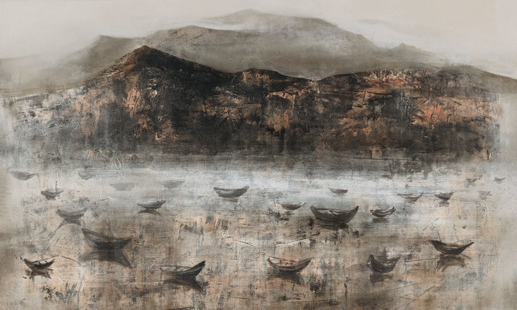 „Barca” to impresyjny pejzaż malarski przedstawiający spokojną taflę wody, po której dryfują drobne łodzie rybackie, a w tle wyłaniają się monumentalne, zamglone masywy górskie. Obraz oddaje wrażenie surowego, północnego poranka – jakby uchwycono moment ciszy przed świtem lub tuż po zmierzchu. Kompozycja jest pełna tekstur: od szorstkich, niemal fakturalnych pociągnięć pędzla, przez subtelne przejścia tonalne, aż po refleksy na wodzie, tworzące efekt delikatnego światła odbijającego się od powierzchni. Łodzie zostały ukazane w półcieniu – jak cienie zakotwiczone w przestrzeni, co nadaje wzorowi medytacyjny charakter. Ten wzór działa niemal jak obraz – opowiada historię, buduje nastrój i skłania do zatrzymania się na chwilę.