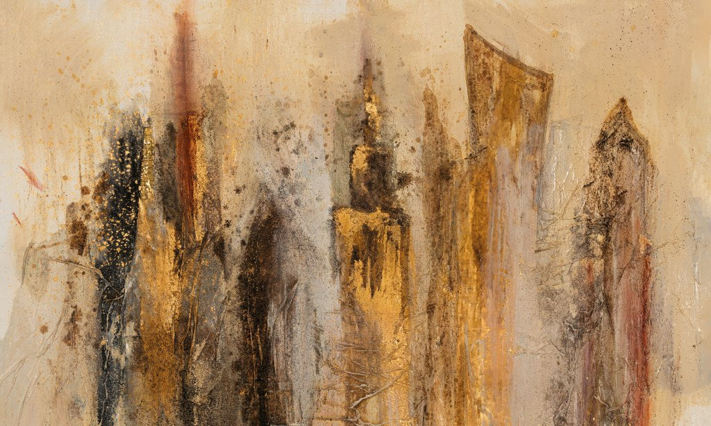 Tapeta „Capital” to pełna ekspresji kompozycja inspirowana wielkomiejską energią, monumentalną architekturą i siłą pionowych struktur. Przypomina artystyczną interpretację panoramy metropolii – wieżowce zbudowane z faktur, kolorów i śladów pędzla zdają się wyrastać z głębokiego tła niczym miasto budowane z emocji. Wzór, mimo dynamicznego charakteru, zachowuje elegancję i wyrafinowanie – dzięki ręcznemu wykonaniu i wyczuwalnej głębi materiału.