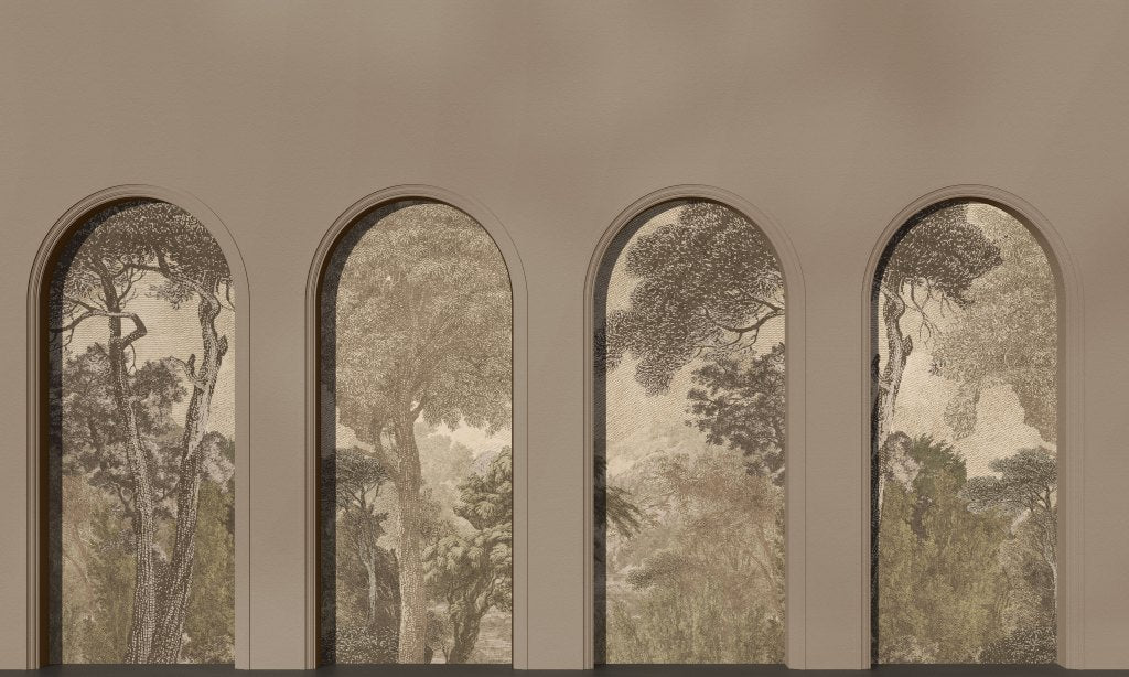 Wnętrze łuków to wzór Hood Light, który wprowadzi do wnętrza las w niezwykle eleganckim, nieco kolonialnym wydaniu. Widok nawiązujących do starych rycin przedstawia dziki, niezbrukany ludzką ręką starodrzew. Ciepłe zielenie i tło lekko stylizowane na stare ryciny, będą idealnym uzupełnieniem zarówno drewnianych mebli jak i przełamaniem nowoczesnych beży. Perspektywa uchwycona w pejzażu sprawi, że wnętrze nabierze głębi i optycznie się powiększy.