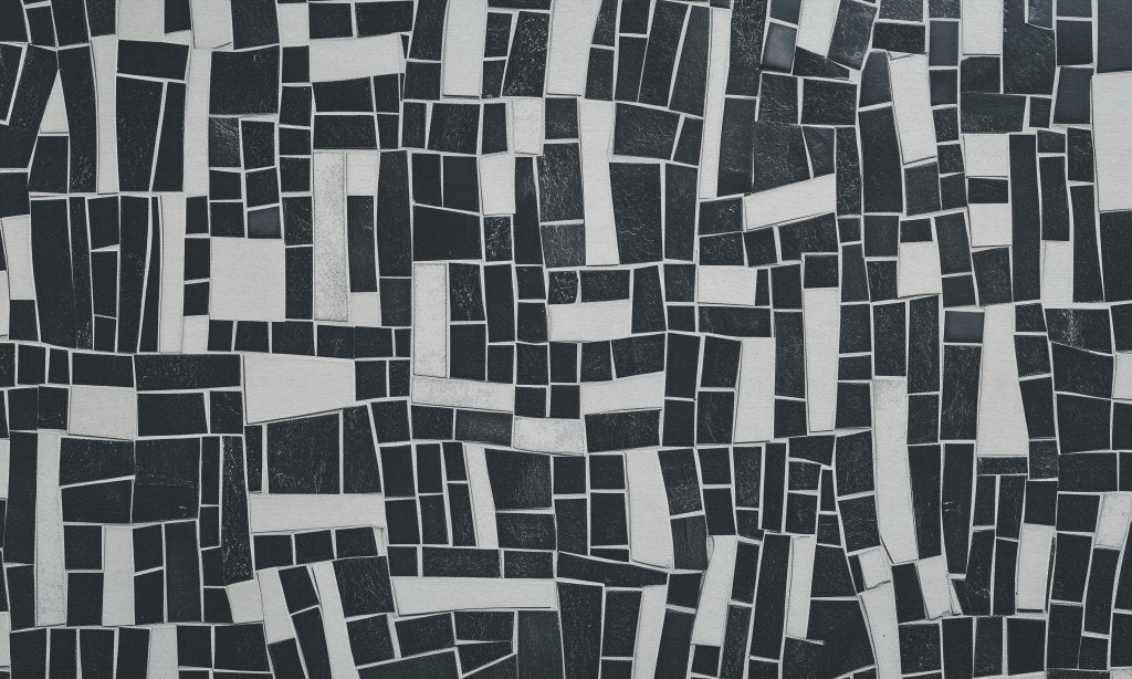 Tapeta opiera się na kontraście czerni i bieli, jednak zróżnicowanie faktur, subtelne przetarcia i niuanse tonalne w obrębie każdej barwy dodają jej głębi. Białe segmenty nie są jednolite – przełamane są odcieniami szarości, natomiast czarne mają grafitowe połyski i drobne ziarniste struktury. To sprawia, że całość nie jest płaska, lecz ma wyraz przestrzenny i niemal trójwymiarowy.