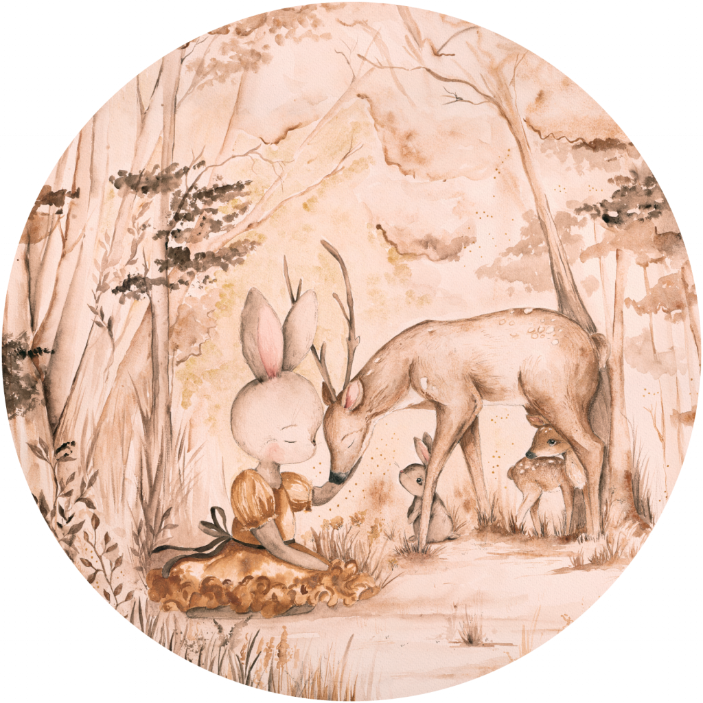 Bambi to urokliwa scena leśna ukazującą bajkowe postaci zwierząt. Delikatne odcienie brązu, beżu i zieleni nadają kompozycji ciepłego, nostalgicznego charakteru, tworząc atmosferę spokoju i harmonii z naturą. Wzór idealnie wpasuje się do pokoju dziecięcego, dodając mu przytulności i bajkowego klimatu. Jego subtelne barwy sprawią, że pokój nabierze ciepła, a obecność uroczych zwierzątek z pewnością przyciągnie uwagę i rozbudzi wyobraźnię dzieci.
