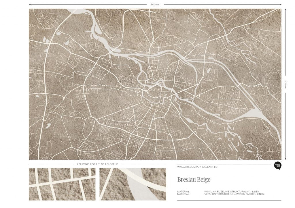 Breslau to grafika przedstawiająca plan miasta Wrocław, ukazując urbanistyczny układ miasta. Na pierwszym planie widoczna jest gęsta sieć ulic, alei i dróg, które tworzą skomplikowany wzór łączący różne części miasta. Najbardziej charakterystycznym punktem na planie jest Stare Miasto, zaznaczone wyraźnie w centrum. Breslau, dzięki zastosowaniu ograniczonej liczby kolorów jest bardzo nowoczesnym wzorem idealnym do biur, restauracji czy innych przestrzeni użyteczności publicznej.