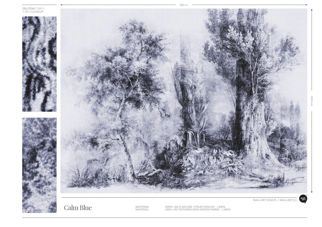 Calm Blue to wzór inspirowany sztuką, w kolekcji Nature, powstały na bazie obrazu z XVIIIw. Granatowo niebieski szkic przedstawiający drzewa, może być delikatną ozdobą każdego wnętrza. Tapeta nawiązuje do natury, wzór uspokaja, a jednocześnie jest bardzo oryginalny. Będzie pasował do salonu, kuchni, sypialni, łazienki czy biura.