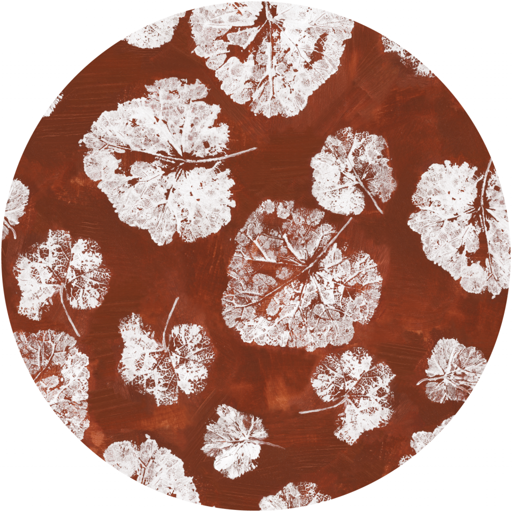 Foglia Rust to wzór namalowany/ odciśnięty ręcznie jako tatuaż roślinny. Obraz został przedstawiony w nowoczesnej formie tapety wielkoformatowej. Wzór przygotowany jest w barwach ziemi wpisujących się w aktualne trendy designu.
