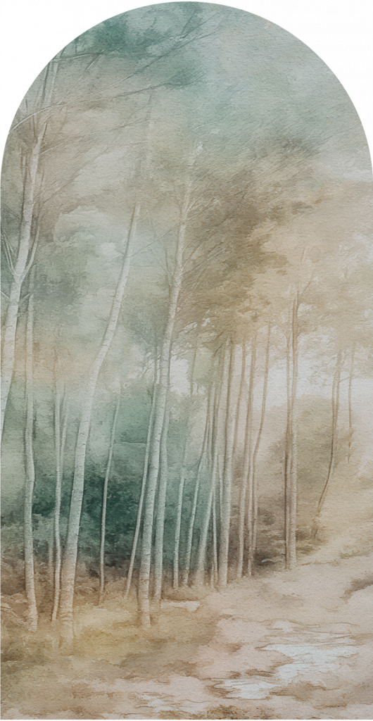 Tapeta „Foresta” to nastrojowa podróż do wnętrza zaczarowanego lasu, gdzie światło przenika przez smukłe pnie drzew i otula ścieżkę miękką mgłą. Kompozycja przypomina ręcznie malowany pejzaż akwarelowy – subtelny, lekko rozmyty, z delikatnie zaznaczonym konturem drzew i roślinności.