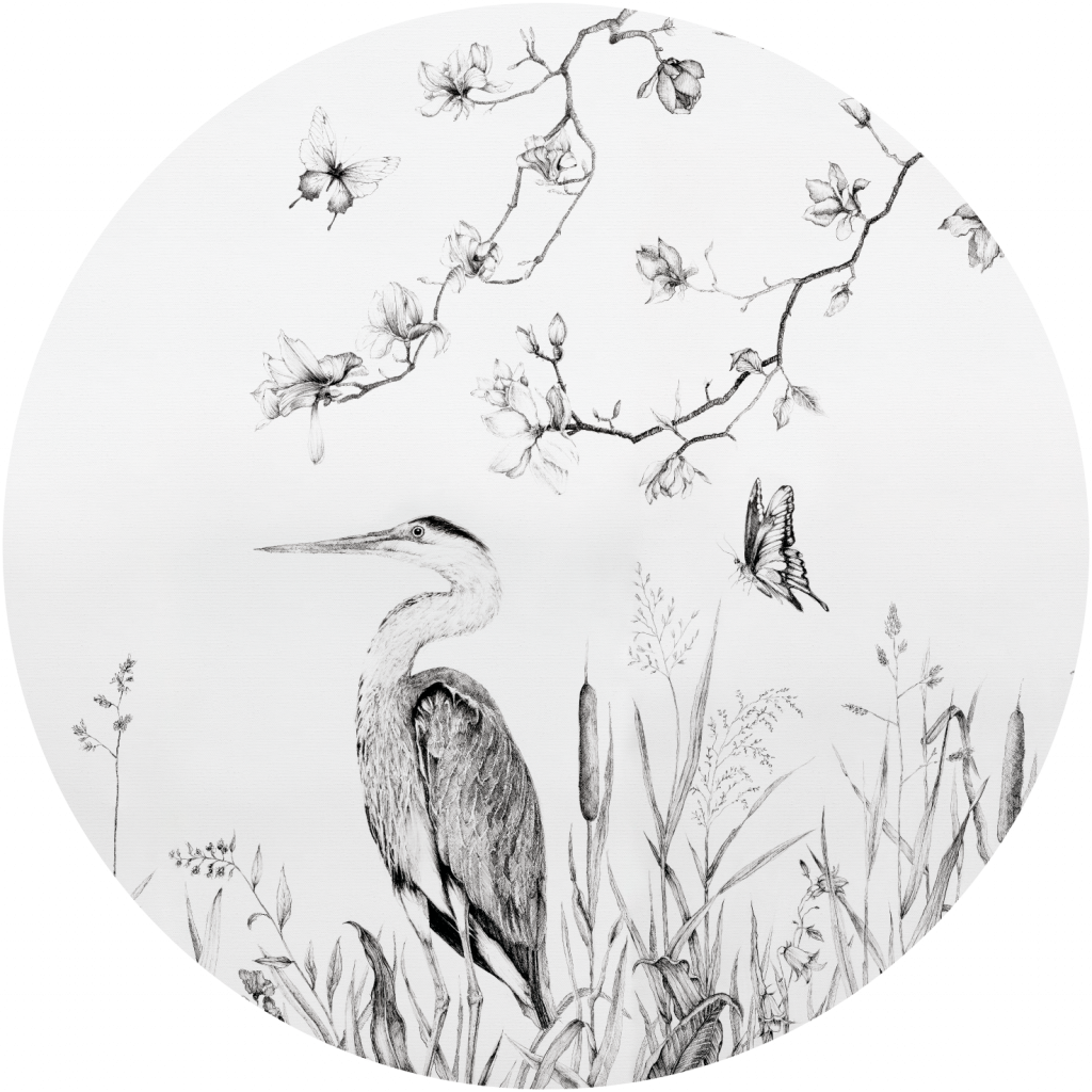 Heron to delikatny, szczegółowy rysunek natury, skupiający się na przedstawieniu czapli wśród traw i kwiatów, z gałązkami drzew i różnorodnymi owadami w tle. Kompozycja jest wykonana w monochromatycznej tonacji, co podkreśla precyzję i subtelność detali. Centralnym elementem wzoru jest czapla, która stoi majestatycznie w wysokiej trawie, otoczona przez liście, kwiaty i trzciny. Każdy element przyrody jest starannie odwzorowany, z dbałością o realistyczne przedstawienie tekstur i form. Heron idealnie wpasuje się w różnorodne style wnętrz, dodając im naturalnego, spokojnego uroku. W salonie, umieszczony nad sofą lub kominkiem, stworzy atmosferę relaksu i harmonii, nawiązując do piękna przyrody. W sypialni może wprowadzić uczucie spokoju i odprężenia, idealne do stworzenia oazy ciszy i wypoczynku.