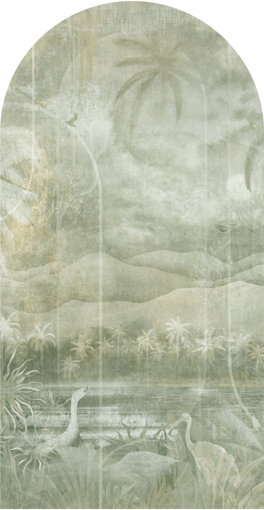 Juca przedstawia subtelną i stonowaną scenę tropikalnego krajobrazu, pełną delikatnych odcieni zieleni, beżu i szarości. Dominują motywy roślinne, z wieloma palmami i bujną roślinnością, tworzą gęstą i bogatą teksturę całej kompozycji. Juca emanuje spokojem i naturalnym pięknem, przedstawiając tropikalny krajobraz w sposób, który jest zarówno realistyczny, jak i marzycielski. Delikatne odcienie i szczegółowe przedstawienie roślinności tworzą harmonijną i estetycznie przyjemną scenę idealną do salonu czy sypialni.