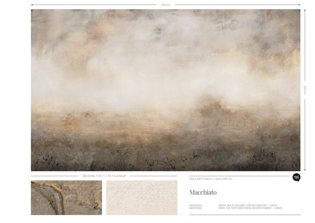Macchiato w języku włoskim oznacza "poplamiony". Latte macchiato to mleko poplamione kawą. Nieoczywisty pejzaż łąki autorstwa Ewy Mróz przedstawia zapadającą w zimowy sen łąkę zanurzoną w mlecznej mgle. Obraz nieco tajemniczy, ale jednocześnie hipnotyzujący, będzie idealnym uzupełnieniem drewnianego wyposażenia wnętrza.