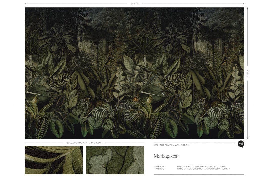Madagascar to gęsty, tropikalny las, pełen bujnej roślinności i umiejętnie wkomponowanych egzotycznych zwierząt. Dominujące ciemne, intensywne odcienie zieleni i czerni, które nadają tajemniczy, nieco groźny charakter. Madagascar świetnie sprawdzi się jako kluczowy element dekoracyjny w dużym, przestronnym pomieszczeniu. Umieszczony na głównej ścianie salonu, sypialni lub gabinetu, nada wnętrzu egzotyczny i elegancki klimat. Ciemne, nasycone kolory obrazu będą pięknie komponować się z jasnymi, neutralnymi ścianami, tworząc kontrast i przyciągając wzrok. Dodatkowo, taki obraz może być idealnym tłem dla roślin doniczkowych, które wzmocnią jego naturalny charakter i wprowadzą do wnętrza odrobinę dzikiej przyrody. Dzięki bogactwu detali i głębi, Madagascar wprowadzi do wnętrza niepowtarzalny, tropikalny klimat.