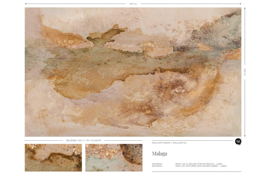 Malaga to abstrakcyjny wzór w ciepłych, ziemistych tonach beżu, brązu i zieleni, z subtelnymi akcentami złota tworząc wrażenie naturalnej, organicznej tekstury, przypominającej krajobrazy lub powierzchnie skalne. Malaga może doskonale współgrać z wnętrzami urządzonymi w stylu boho, rustykalnym lub eklektycznym. Ciepłe kolory wzoru wprowadzą do przestrzeni przytulność i harmonię, tworząc atmosferę sprzyjającą relaksowi i wyciszeniu. Dzięki swojej abstrakcyjnej formie, Malaga jest bardzo uniwersalna i może być interpretowany na wiele sposobów, co dodaje wnętrzu charakteru i indywidualności. W przestrzeniach komercyjnych, takich jak kawiarnie, restauracje czy hotele, może przyciągać wzrok i intrygować gości, dodając wnętrzom artystycznego wyrazu. W połączeniu z naturalnymi materiałami, takimi jak drewno, len czy wełna, obrazek ten podkreśli ekologiczny i zrównoważony charakter wnętrza. Może być również ciekawym elementem kontrastującym w nowoczesnych, minimalistycznych aranżacjach, gdzie jego organiczna forma złagodzi surowość nowoczesnych linii i materiałów.