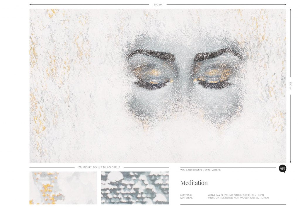 Meditation - to obraz z kolejnej mini kolekcji Magdaleny Głodek dla Wall Art. Słowo medytacja pochodzi od łacińskiego wyrazu meditatio oznaczającego zagłębianie się w myślach, rozważanie, namysł. Jej efektem jest uzyskanie wyciszenia, koncentracja czy spokój czyli emocji, które biją od obrazu Meditation. Delikatne szarości i złoto, sadzone na jasnym tle, doskonale wpasują się w proste, nieco ascetyczne pomieszczenia, którym chcemy dodać nutki szaleństwa.