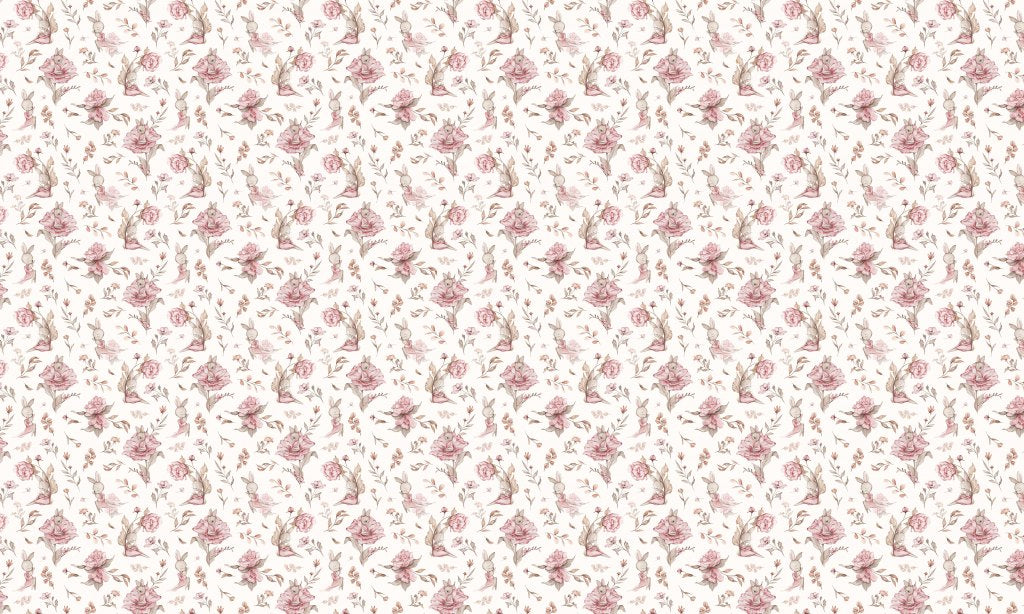 Mimi to dziecięca interpretacja tapety w stylu angielskim. Finezyjnie narysowane kwiaty w połączeniu z uroczymi króliczkami stanowią jednocześnie uroczą, ale i wyrafinowaną dekorację dziecięcego pokoju. Przedstawienie elementów zielonych roślin w wersji beżowej ułatwia wkomponowanie zarówno białych jak i drewnianych mebli.