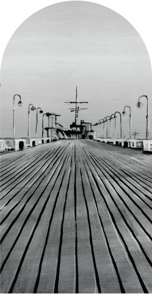 Molo to czarno-biała grafika przedstawiająca wizytówkę Sopotu.Symetryczne lampy uliczne oraz drewniane deski molo prowadzą wzrok w kierunku centrum wzoru, gdzie widać zarys statku. Molo świetnie sprawdzi się w nowoczesnym salonie, dodając mu minimalistycznego, a jednocześnie wyrafinowanego charakteru. Może być również doskonałym uzupełnieniem wnętrz w stylu marynistycznym lub skandynawskim, gdzie stonowane kolory i proste linie są kluczowe. Grafika ta, dzięki swojej monochromatycznej kolorystyce, może harmonijnie komponować się z różnorodnymi paletami barw w pomieszczeniu, w tym stanowić interesujący kontrast w bardziej kolorowych wnętrzach, nadając im wyrafinowanego akcentu i podkreślając elegancję całej aranżacji.
