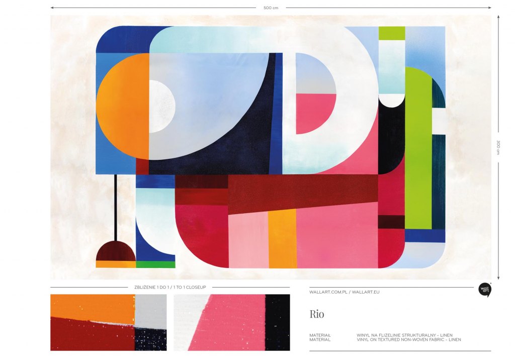 Rio to abstrakcyjną kompozycję, złożoną z geometrycznych kształtów i żywych kolorów. Dominują w nim formy takie jak półkola, prostokąty, linie i elipsy, które są umieszczone na neutralnym, jasnym tle. Kolorystyka wzoru jest intensywna i zróżnicowana, obejmująca odcienie niebieskiego, pomarańczowego, czerwonego, zielonego, różowego i białego. Na całej powierzchni Rio widoczne są delikatne przejścia tonalne i gradienty, które nadają kompozycji głębi i trójwymiarowości. Czarny pionowy pasek z okrągłym zakończeniem w lewej dolnej części dodaje struktury i porządku w abstrakcyjnej kompozycji. Rio jest pełen energii i życia dzięki swojej jasnej i zróżnicowanej kolorystyce oraz dynamicznemu układowi form. Jego geometryczna kompozycja i intensywne barwy sprawiają, że doskonale nadaje się do nowoczesnych wnętrz, gdzie może stanowić wyrazisty punkt centralny.