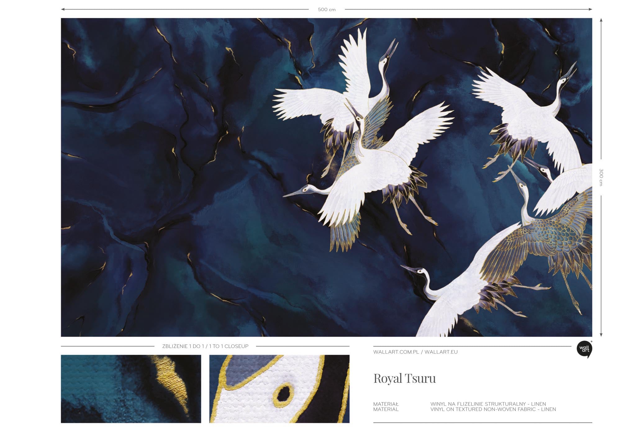 Tapeta Royal Tsuru to zestawienie koloru kremowego, królewskiego granatu i detali w barwach złota. Idealne uzupełnienie aranżacji w małych wnętrzach, pasuje do stylu boho, naturalnego, nowoczesnego i klasycznego.