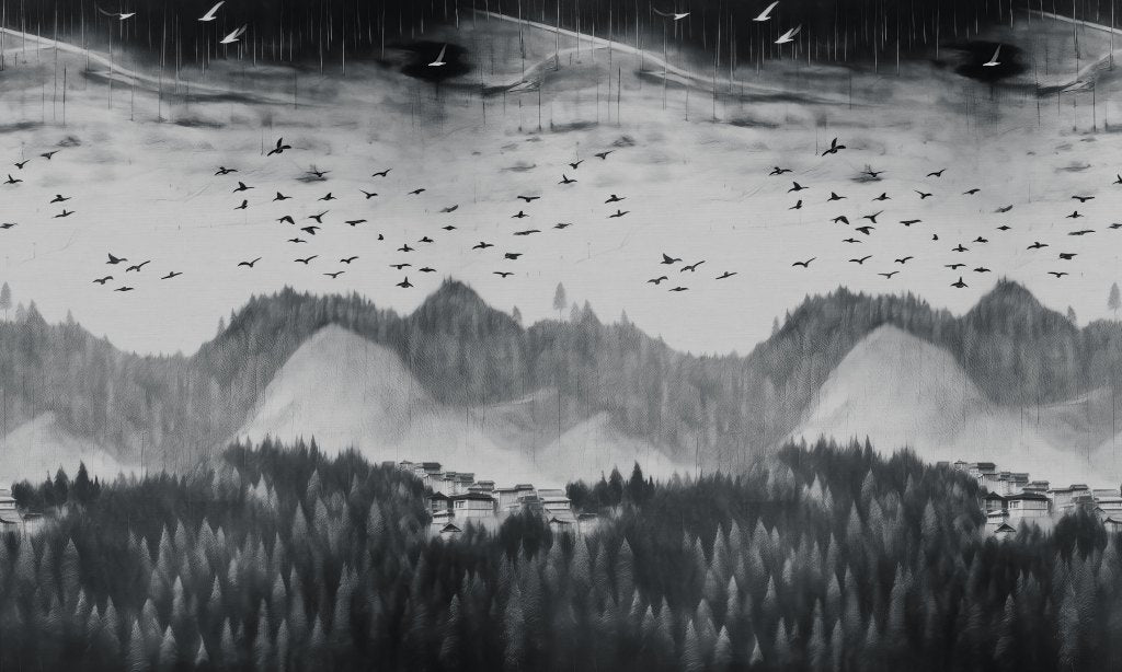 Tenebis to mroczny, górski pejzaż utrzymany w niesłabnąco popularnych szarościach z nutką brutalizmu. Nieco niepokojące stado ptaków lecące nad pogrążonym w chmurach szczytami doda wnętrzu tajemniczości i głębi. Ciemna kolorystyka wzoru stanie się mocnym akcentem w jasnym wnętrzu lub dopełni surowy klimat utrzymanego w ciemnych barwach.