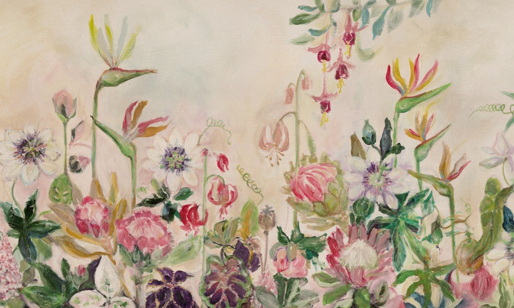 Tutti Frutti to barwna, kwiatowa łąka namalowana przez Annę Kowalczyk z Wrocławia. Kolory niosą powiew lata do wnętrza. Barwy fioletu, różu, moreli, koralowego, zieleni na jasnym tle, idealnie komponują się z ciepłymi wnętrzami w stylu boho jak i minimalistycznymi. Tapeta będzie nietuzinkową dekoracją pokoju dziecięcego, sypialni, kawiarni, lodziarni lub salonów medycyny estetycznej.